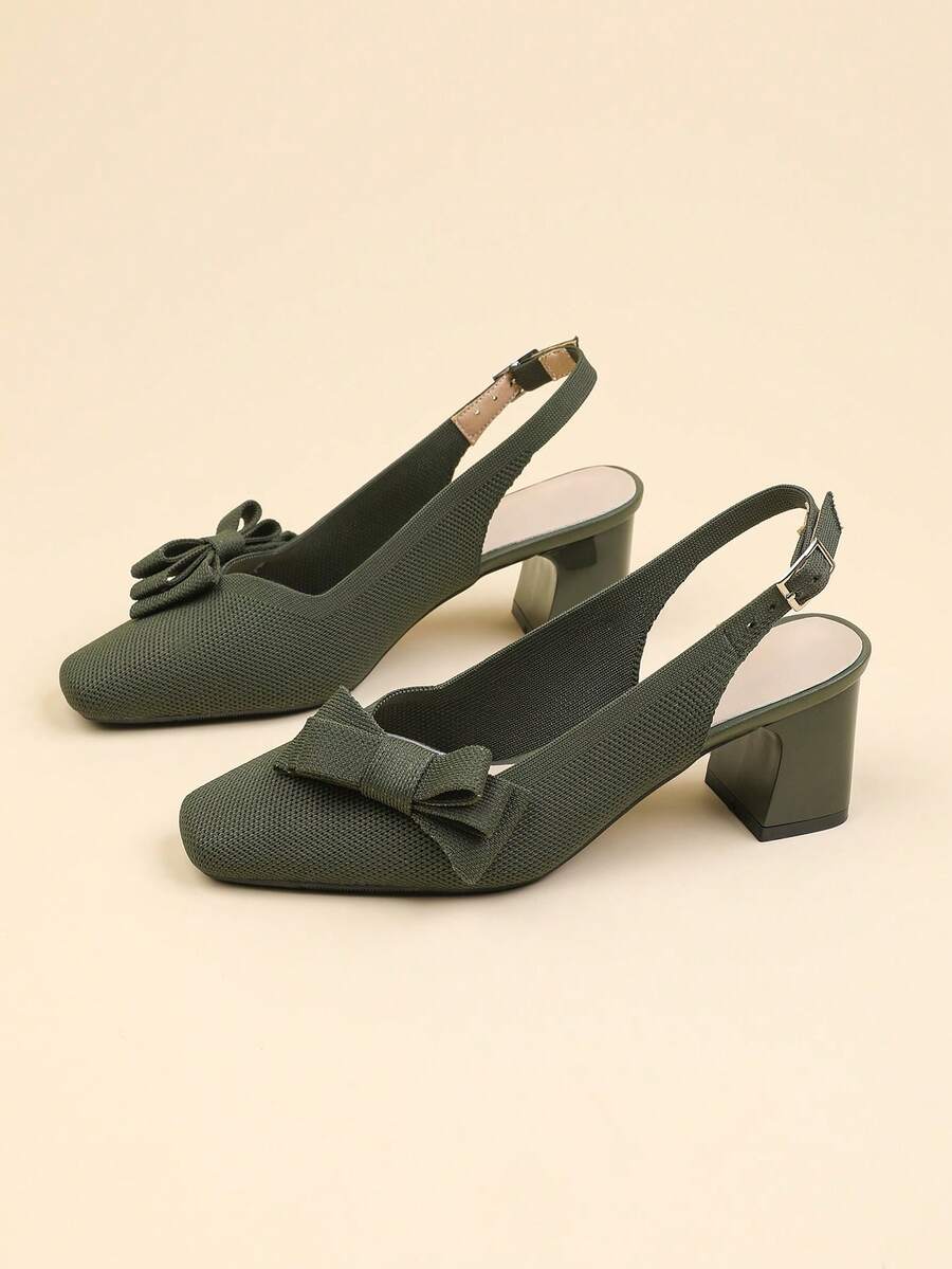 1 Pair Square Toe Slip-On Shoes With Bowknot, Solid Color Backstrap Chunky Heel Pumps For Women, Suitable For Outdoor Walking, Party, Office, Skirts, Casual Pants
