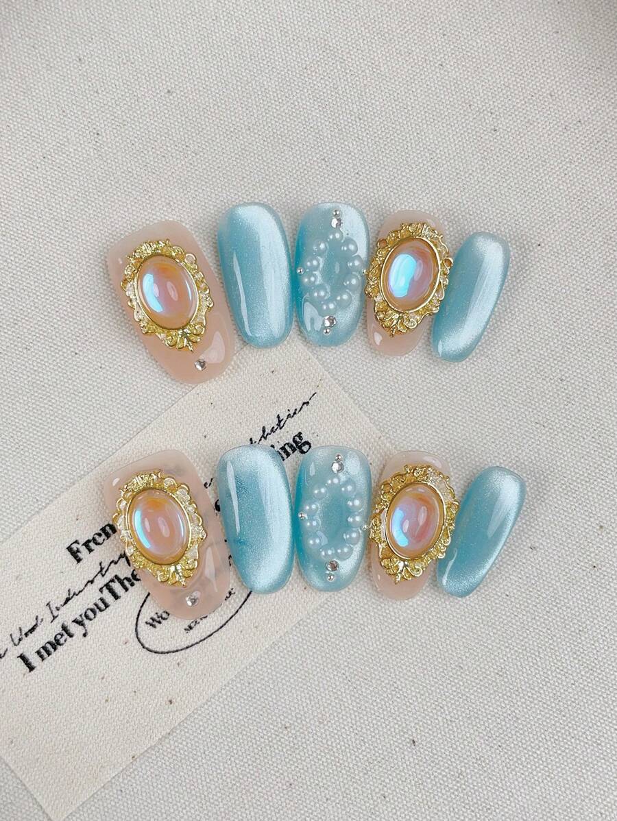 10Pcs Short Oval Handmade Press On Nails, Glamorous And Royal Fake Nails, Orange And Blue Nails, The Moon Erhai Lake, Removable And Reusable, Includes 1Pc Jelly Glue And 1Pc Nail File, Suitable For Daily, Workplace, School, Dating, Parties, Dances. Nail Supplies Nails