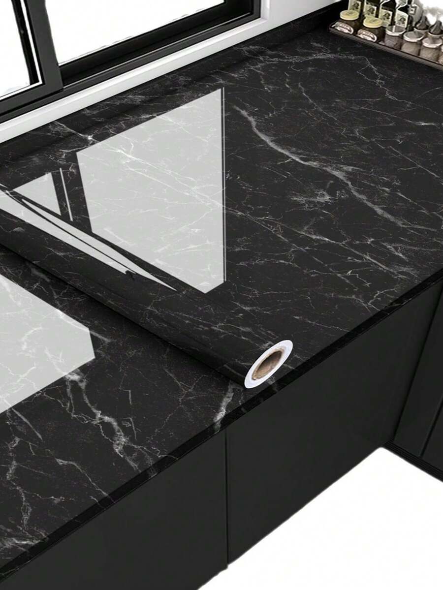 1pc Black Marble Pattern Self-Adhesive Kitchen Sticker, Nordic Minimalist Waterproof Oil-Proof Glossy Kitchen Countertop Stove Cover, Cabinet Drawer Anti-Fouling Wallpaper