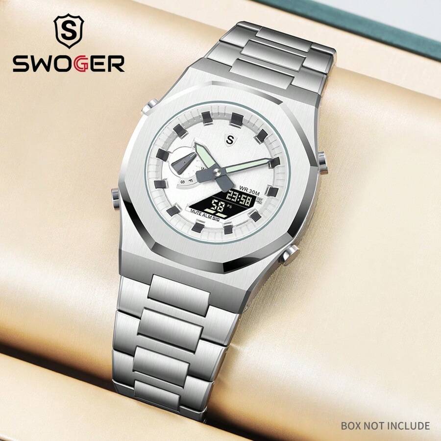 1pc Men's Executive Watch With Dual Display, Alarm And Date Function, Stainless Steel Strap