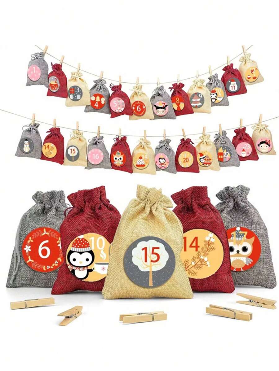 24Pcs 2025 New Year Calendar Bags Christmas 24 Days DIY Advent Calendar Xmas Countdown With 24 Pieces Buffalo Check Snowflake Elk Santa Drawstring Christmas Bags For Party Decoration Countdown Decoration With Advent Numbers Stickers, Clips, Rope