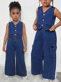 SHEIN SLAYR KIDSSHEIN 2pcs/Set Young Girls Y2K Blue Denim Lapel Long Sleeve Short Jacket And Loose Fit Pants,Young Girl Denim Set ,Vintage Set, 2000s Style,Fall Clothes,Autumn Clothes ,Casual And Fashionable Vacation Outfits,Fall Set Clothes,Autumn Set Outfit,Street Wear,Young Girl Outfits Winter
