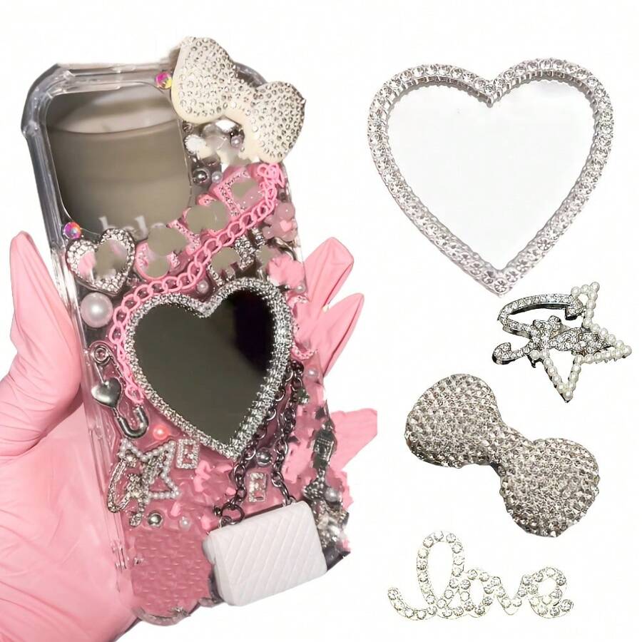 4pcs/Set Luxury Bling Rhinestone Bowknot Metal Hollow Faux Pearl Star Heart Shaped Mirror With Rhinestone Love Junk Phone Case Laptop Scrapbook Makeup Box Hair Clip Water Bottle Decoration Charms Accessories Kawaii Y2K Girls DIY Crafts Ornament
