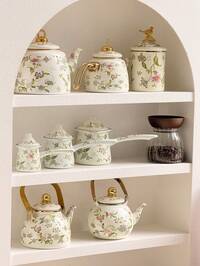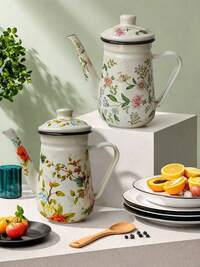 madeby BLANC1pc/2pcs Colorful Enameled Coffee/Tea Pot, 1.2L Delicate Enamel Coffee Pot, Handle Pot Coffee Pot, Slim Spout Oil Pot Kettle, Family Boiling Pot, Tea Pot, Gift Pot For Home, Cafe, Party, Household Decor, Small Items Storage Bowl, Coffee Beans, Tea Leaves Storage, Tea Set Accessories, Thick Manual Tilting Water Pot, Floral Pattern Tea Pot, For Electric Or Gas Stove Coffee/Tea Brewing