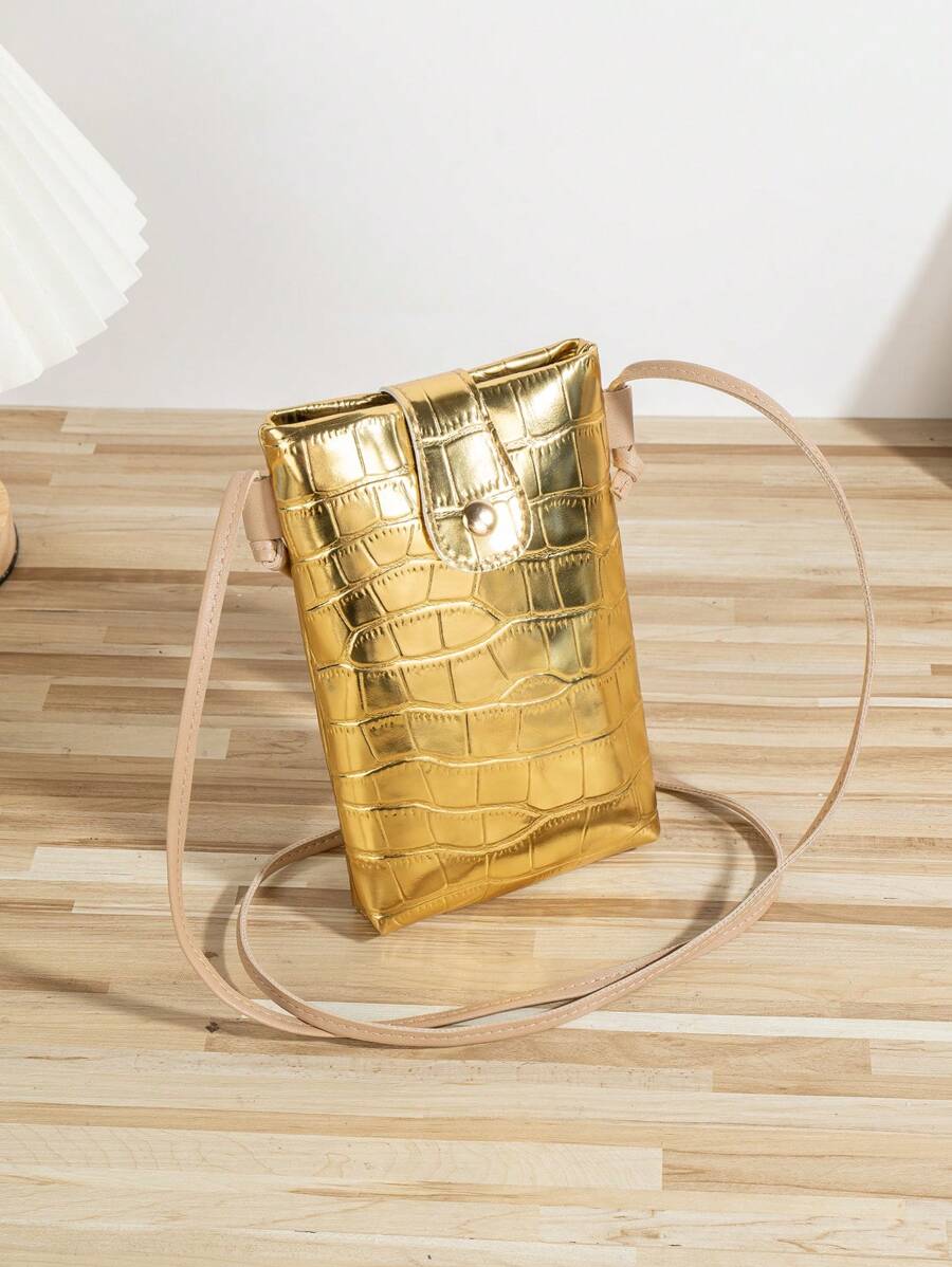 Crocodile Embossed PU Leather Gold Phone Pouch, Minimalist & Fashionable, Can Hold Coins, Shoulder Or Crossbody Strap, Anti-Theft Buckle Design, Ideal For Travel, Festivals And More. Women's Wallet, Essential For Vacation, Perfect For Summer, Vacation And Beach Trips. , Gold Bag
