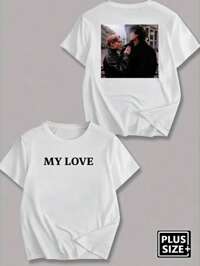 Personalized Custom Photo Printed Casual T-Shirt For Plus Size Men, Customize With Photos Of Family, Friends, Couples Or Pets, Suitable For Valentine's Day, Birthday Party, Anniversary, Comfortable Short Sleeve Round Neck Black Tee, Gift Idea For Plus Size Men