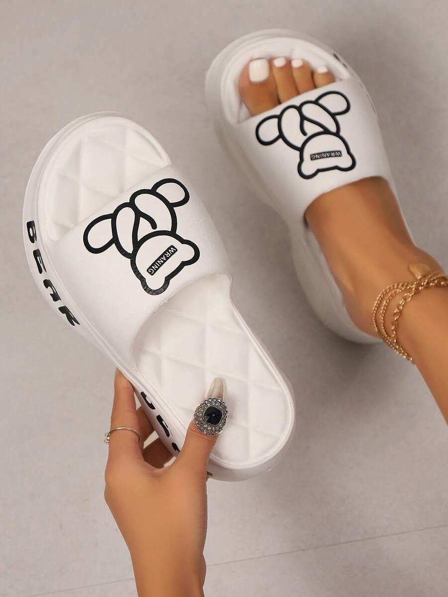 Fashionable Women's Cute Cartoon Bear Print EVA Molded Comfortable, Lightweight, Durable, Non-Slip Casual Open Toe Slippers, Suitable For Spring/Summer High Heel, Can Be Worn Outdoors Or At The Beach, Applicable For Daily Life, Beach Walks, Work And Various Occasions