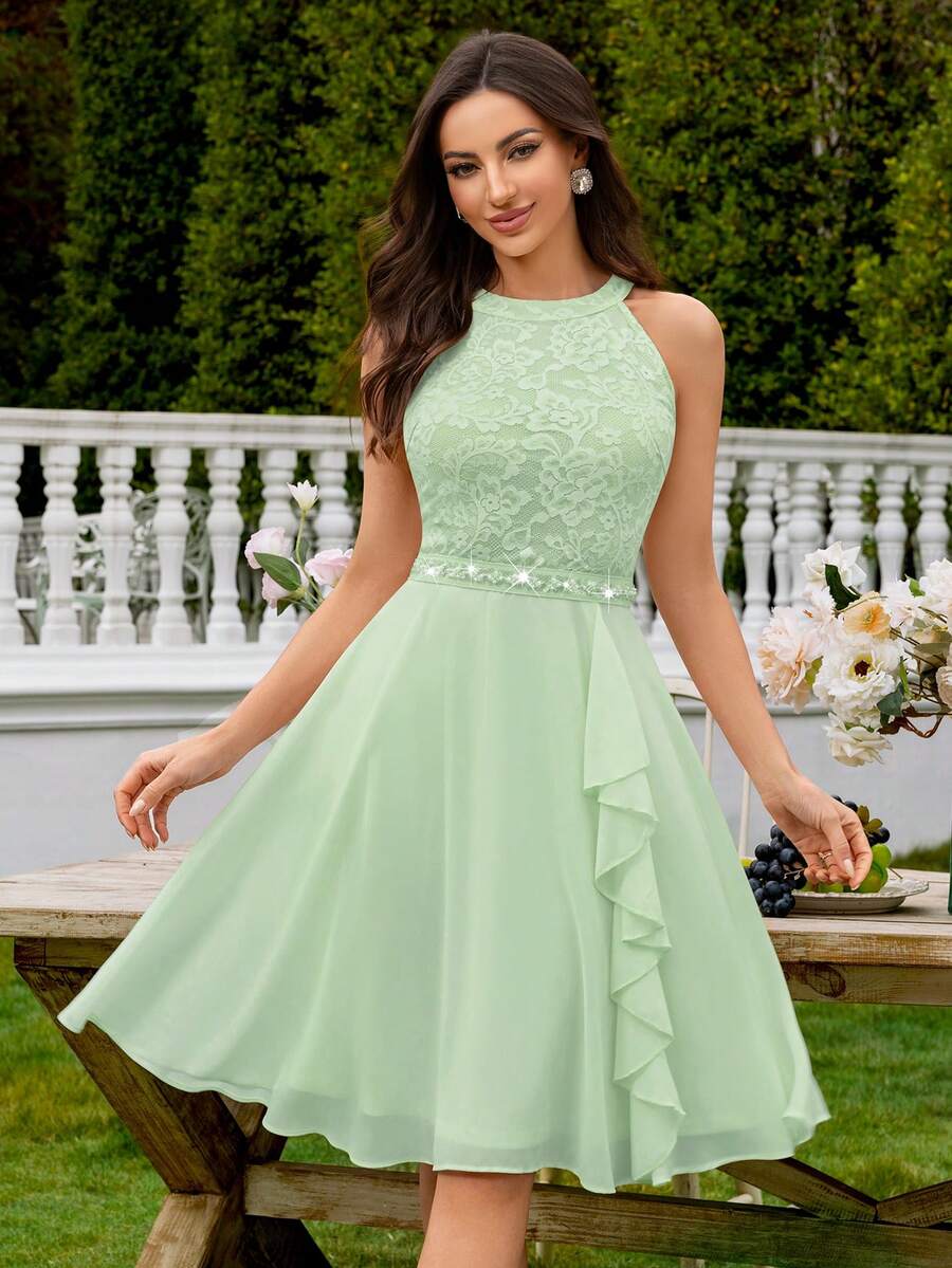 MIUSOL Floral Lace Backless Ruffle Hem Chiffon Skirt, Elegant Semi-Formal Wedding Guest Dress, Suitable For Birthday, Graduation, Homecoming And Other Occasions