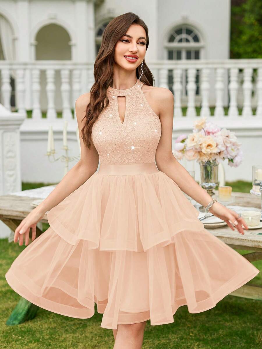 MIUSOL Sequin Floral Lace Halter Neck Ruffle Layered Hem Mesh Ballgown Skirt, Summer Women's Dress, Wedding Guest Outfit, Suitable For Vacation, Birthday Party, Graduation Ceremony And Other Occasions