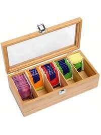 1pc Bamboo Tea Bag Organizer With Transparent Acrylic Lid - Multi-Compartment Storage Box For Tea, Coffee, And Desk Supplies, Natural Wood Finish, Colorful Tea Bag Display, Perfect For Kitchen Or Office Organization, Tea Storage, Shelf Baskets