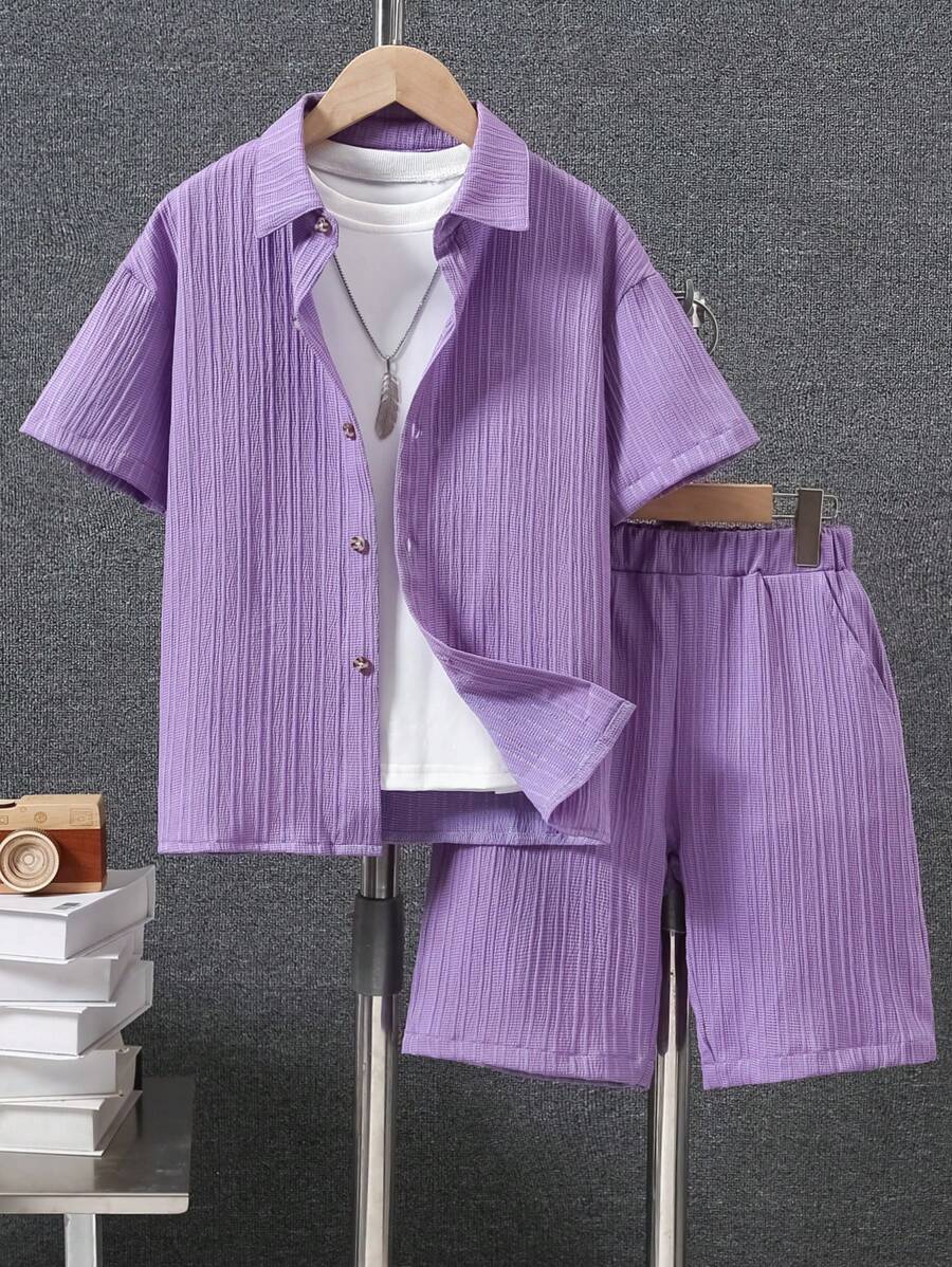 SHEIN Tween Boys' Solid Color Short Sleeve Shirt And Shorts 2 Pieces Set, Casual, School, Campus, College