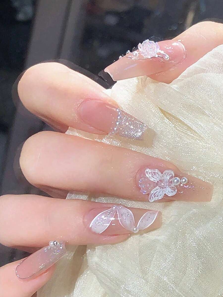 Upgrade Your Look - 24pcs Medium Length Ballet Powder, Sheer & Nude Color Pure Desirable Ins Style Rhinestone Butterfly 3D Crystal Nail Art Stickers With White Tassel & 1pc Jelly Glue & 1pc Grinder Press On Nails Nail Supplies