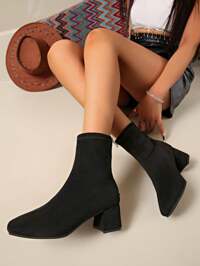 Women's Square Toe High Heel Ankle Boots, Back Zipper Design, New 2024 European And American Style Black High-Top Booties, Chunky Heel, Outdoor Women Hiking Boots, Suitable For Party, Banquet, And Evening Outings