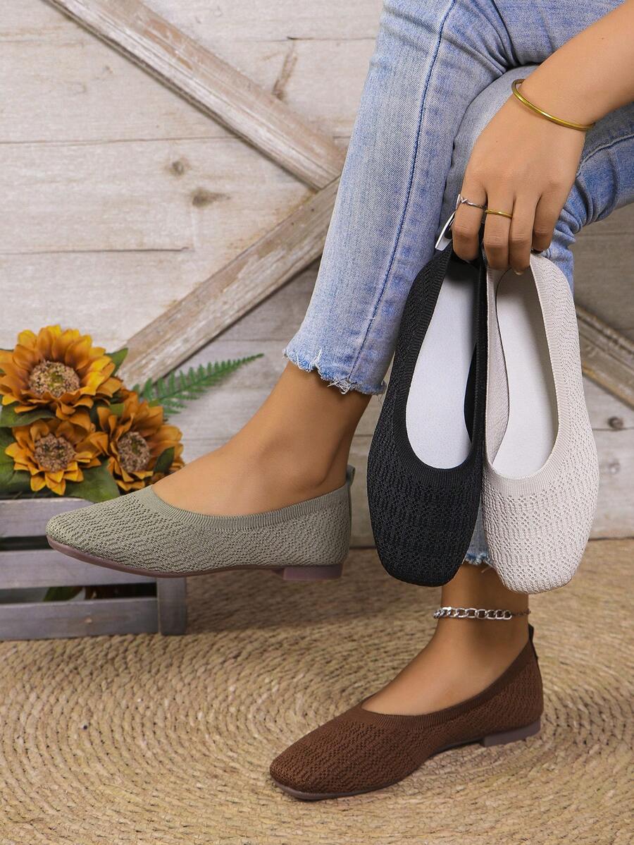 Women's Casual Knit Flat Shoes - Square Toe Slip-On With Tassel Detail, Lightweight Breathable Fabric Upper And Rubber Sole, Suitable For Walking, Home, Outdoor - Olive Green, Black, White, Brown, Comfortable For All Seasons, Casual Slip-On Mules, Synthetic Insole