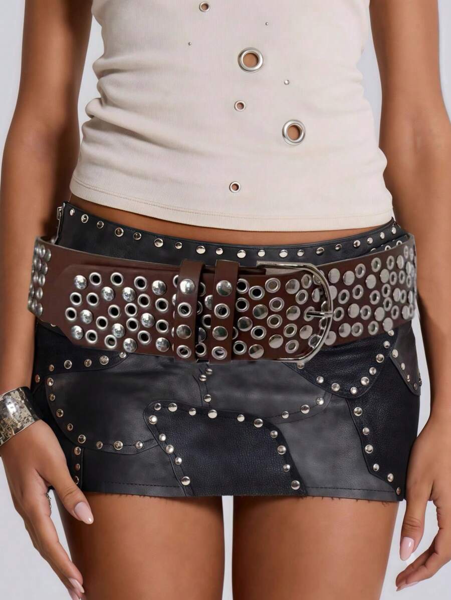 Y2K Brown Wide Belt, Sexy Baddie Style Metal Punk Street Rivet Decoration Faux Leather Belt