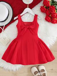 SHEIN Young Girl Red Bow Decor Waist Design Dress, Red Sister Matching Outfit